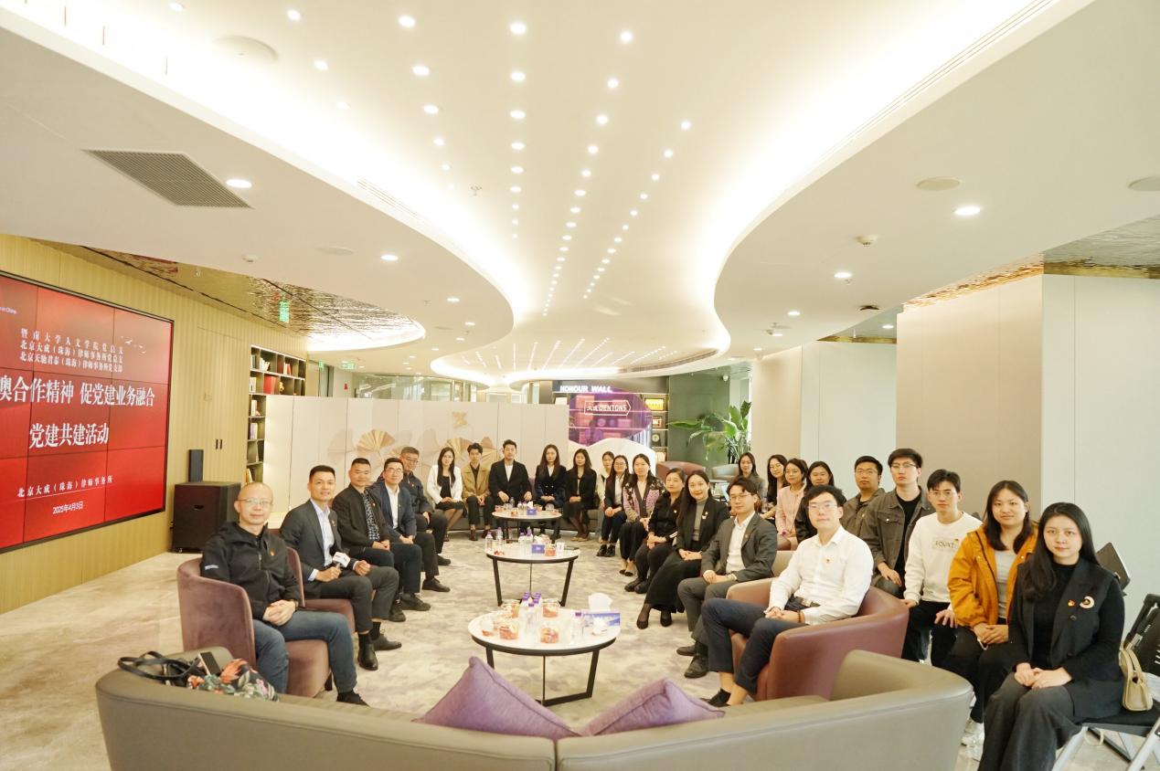 为深入贯彻习近平总书记视察广东、澳门重要讲话重要指示精神,在推动融合发展中展现党员作为,4月3日下午,暨南大学人文学院党总支联合校友单位北京大成(珠海)律师事务所党总支、北京天驰君泰(珠海)律师事务所党支部,赴横琴粤澳深度合作区开展“学琴澳合作精神,促党建业务共融”主题党建共建活动。