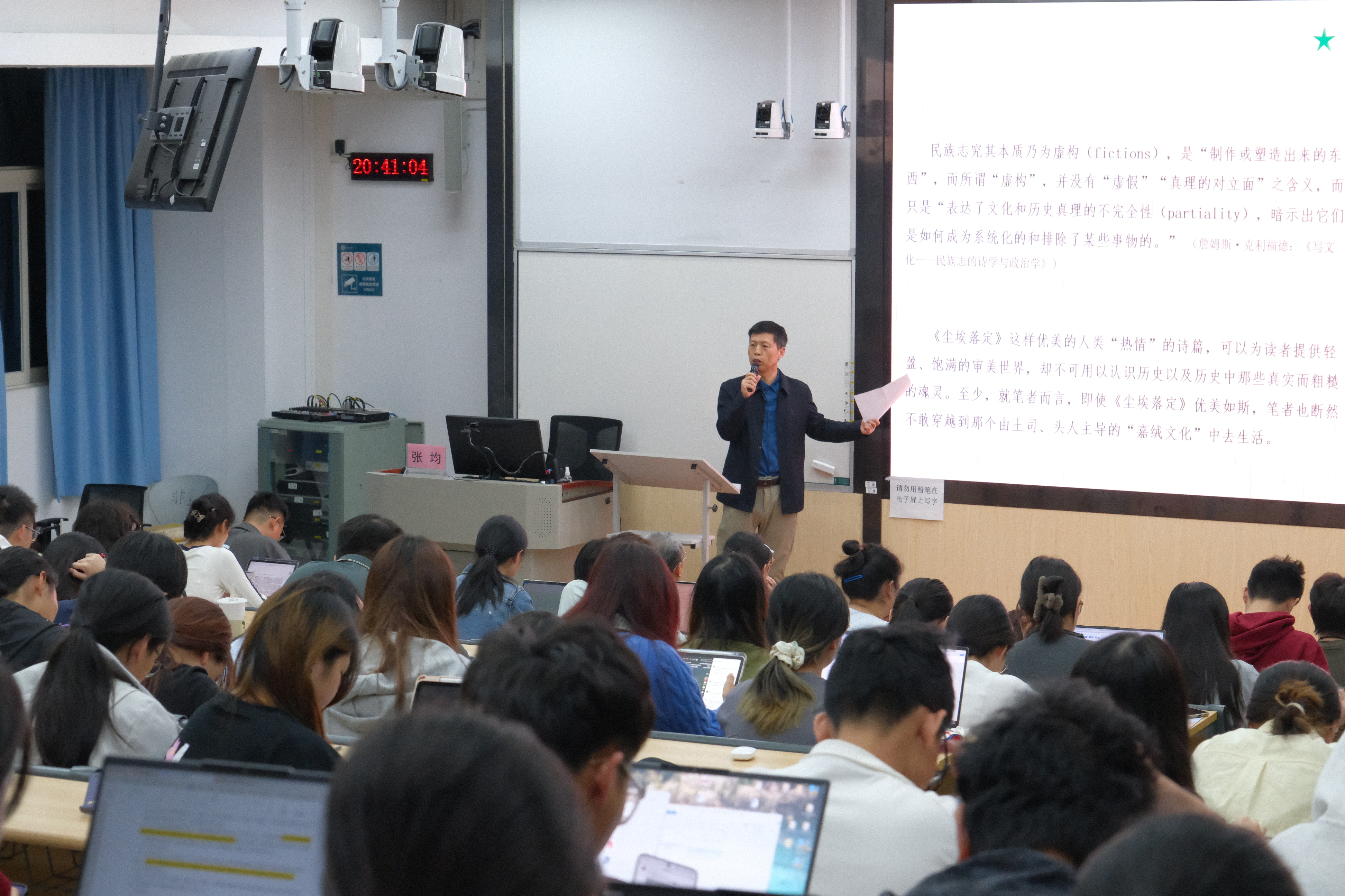 讲座伊始,张均以作家阿来的成长背景与创作历程为切入点,层层拆解《尘埃落定》的创作初心。他指出,阿来的创作动因既源于土司官寨旧址的独特生命体验,更蕴含着对家乡生态破坏、文化变迁的深刻反思,这份对故土的眷恋与忧虑,赋予作品厚重的精神底色。作为中国当代文学中成就最高的少数民族题材长篇小说之一,《尘埃落定》跳出了传统民族叙事的局限,以独特的视角重构了藏地的历史与文化图景。随后,张均剖析了小说中“普遍人性”叙事策略的内在矛盾,进一步引导同学们思考少数民族的写作困境,即如何在文化表达与历史真实之间找到平衡点。