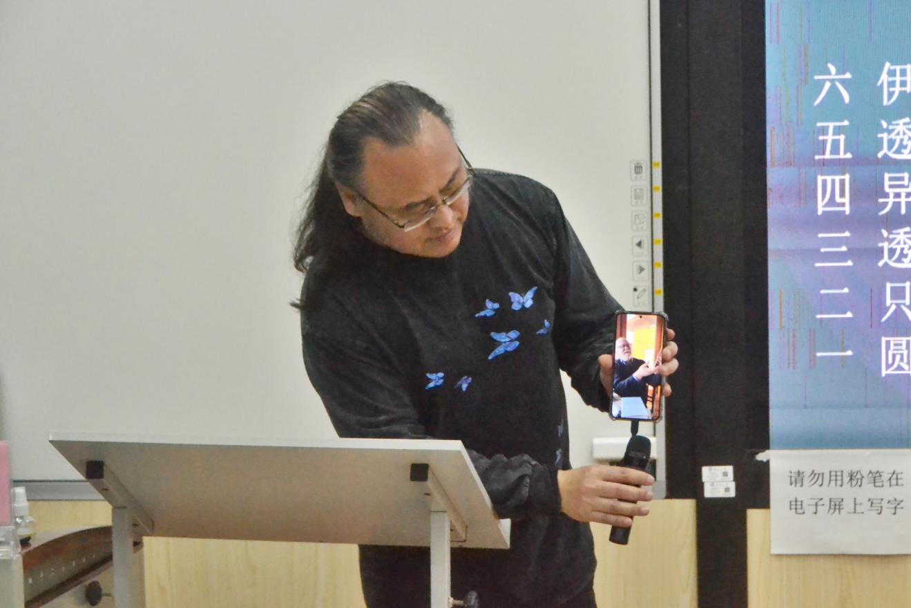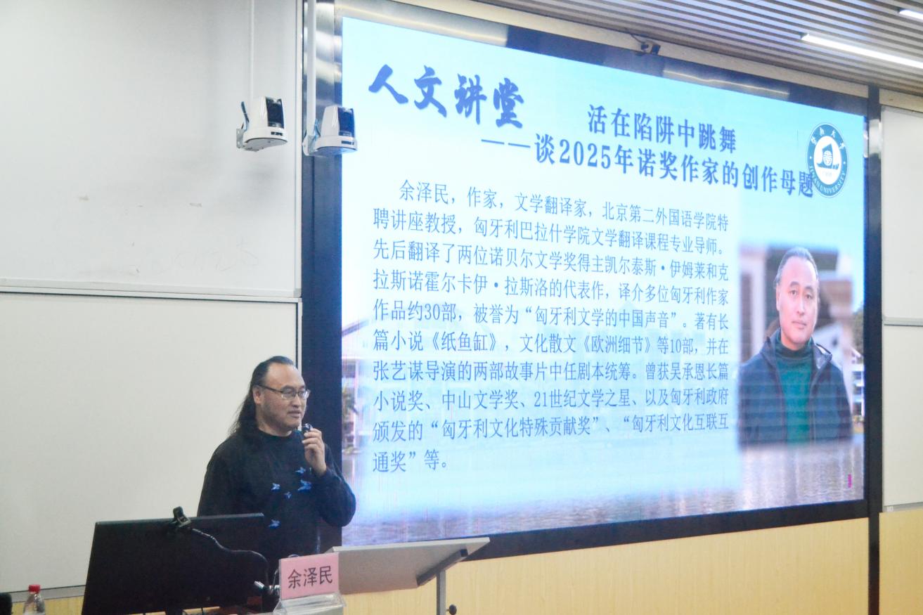 2025年,匈牙利作家克拉斯诺霍尔卡伊·拉斯洛获得诺贝尔文学奖,余泽民作为其挚友,担任了《撒旦探戈》《反抗的忧郁》《温克海姆男爵返乡》等多部代表作品的译者,对其创作理念与文学风格有着深刻的理解。讲座中,余泽民引导同学们一同剖析作者创作的核心文学母题,详解其作品中对人类命运、时代困境的深刻叩问。他提到拉斯洛是一位具有坚定文学信念的作家,在创作过程中有着鲜明特点,即其作品始终围绕着人类命运,主题一脉相承,人物也在作品中有相应的承接。例如《撒旦探戈》中以撒旦谱写的探戈隐喻人类进程,其中所勾勒的生活闭塞却无处可逃的村庄,就是当时东欧社会的缩影。讲述之余,余泽民还现场与同学们分享了拉斯洛亲口哼唱的书中旋律,让同学们有机会以另一种视角窥见这位诺奖作家创作时的心境状态。